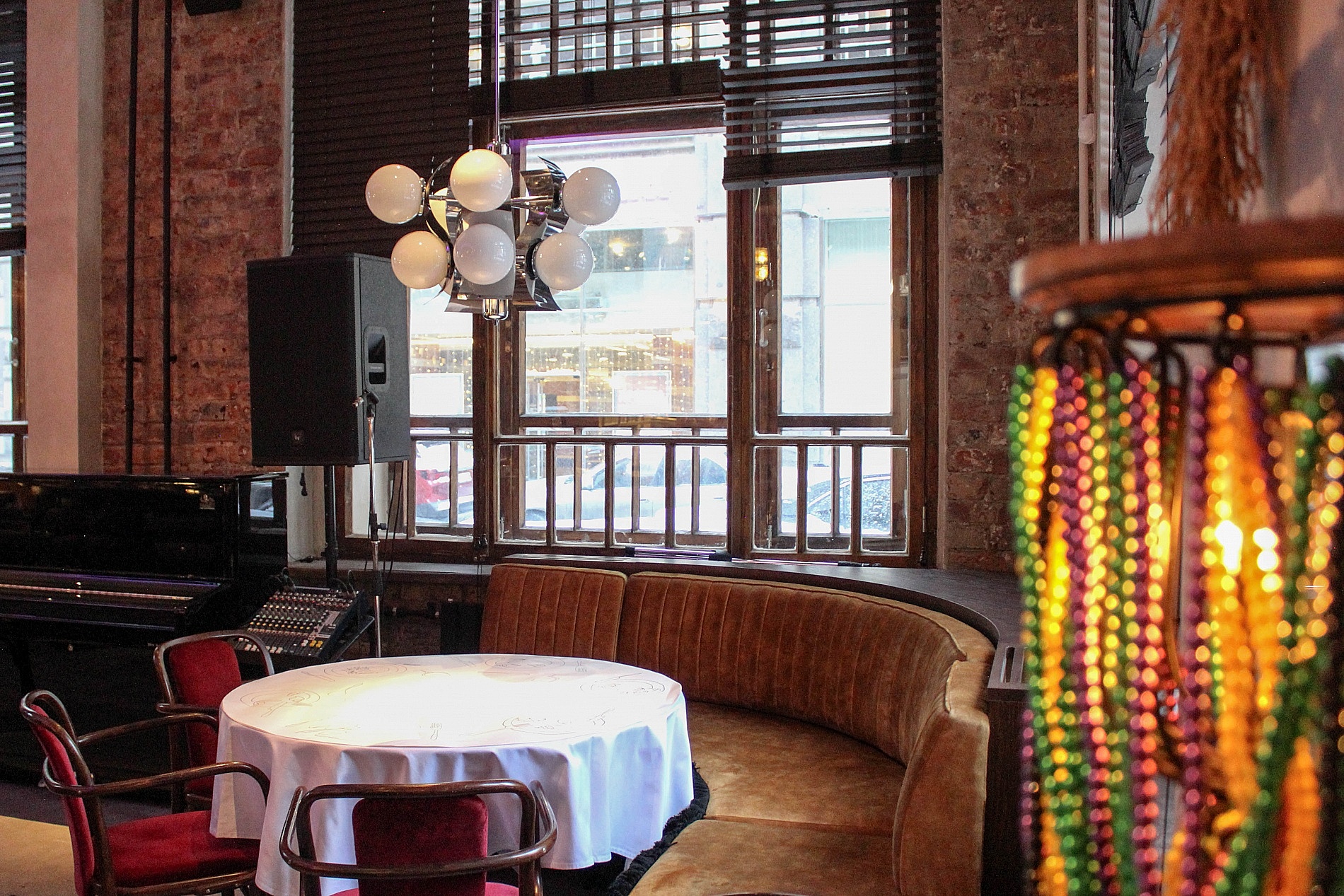 Коллекция бус, которая украшает зал, была собрана на новоорлеанском празднике Марди Гра.