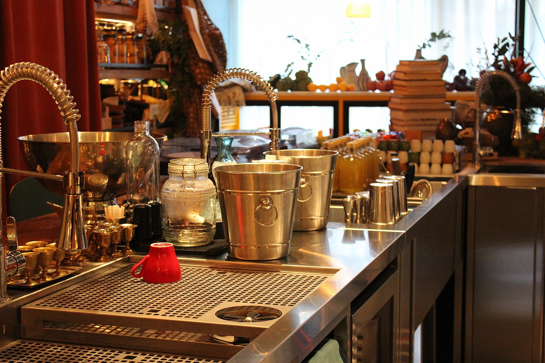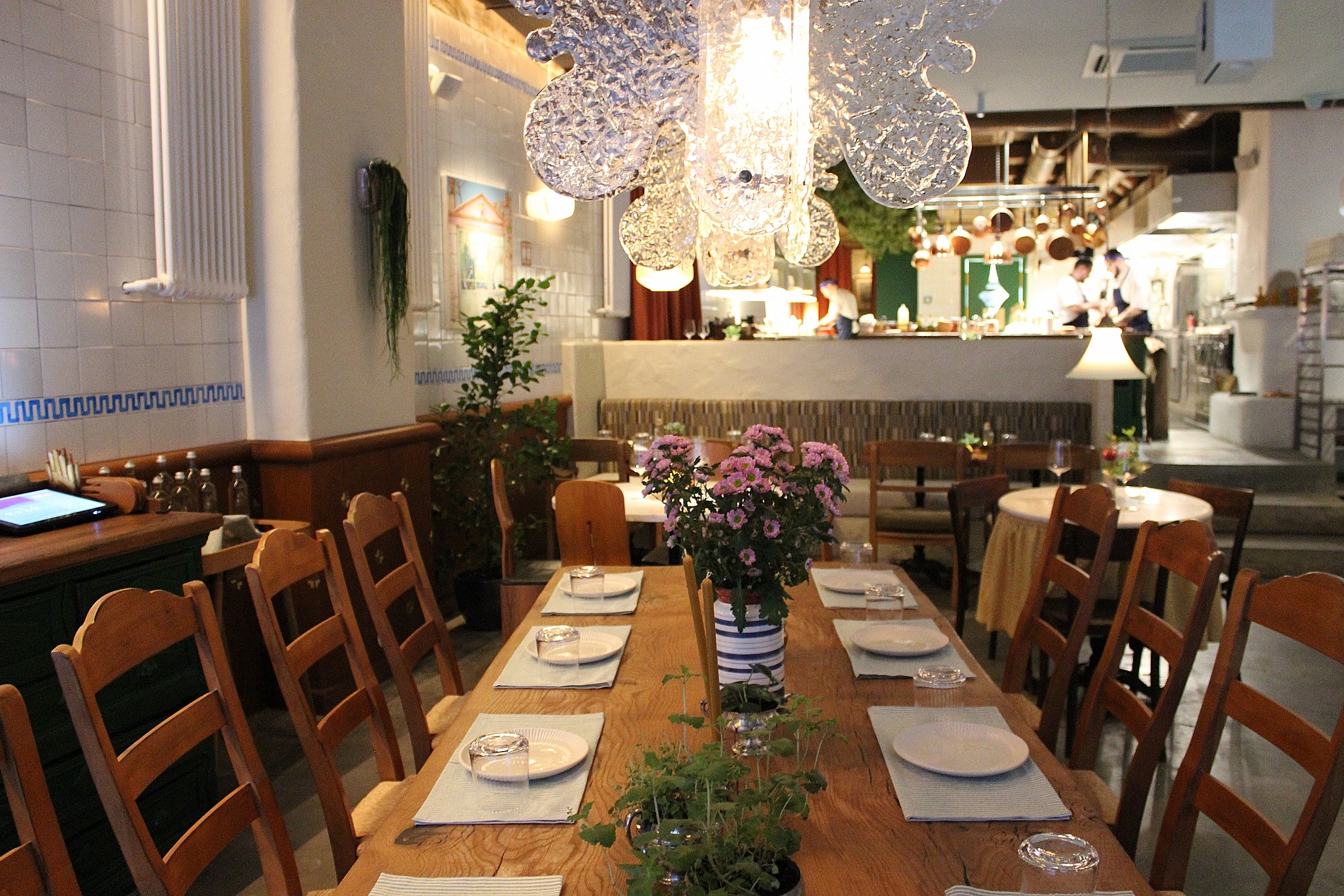 Интерьер ресторана - это настоящая симфония цвета и света. Ручная роспись на настенной плитке, римско-византийские орнаменты из мозаики и стилизованная мебель создают атмосферу бесконечного праздника. Плетеные корзины с свежим травами и нарядная витрина с амюзбушами и домашнимиликерами придают месту особый шарм.