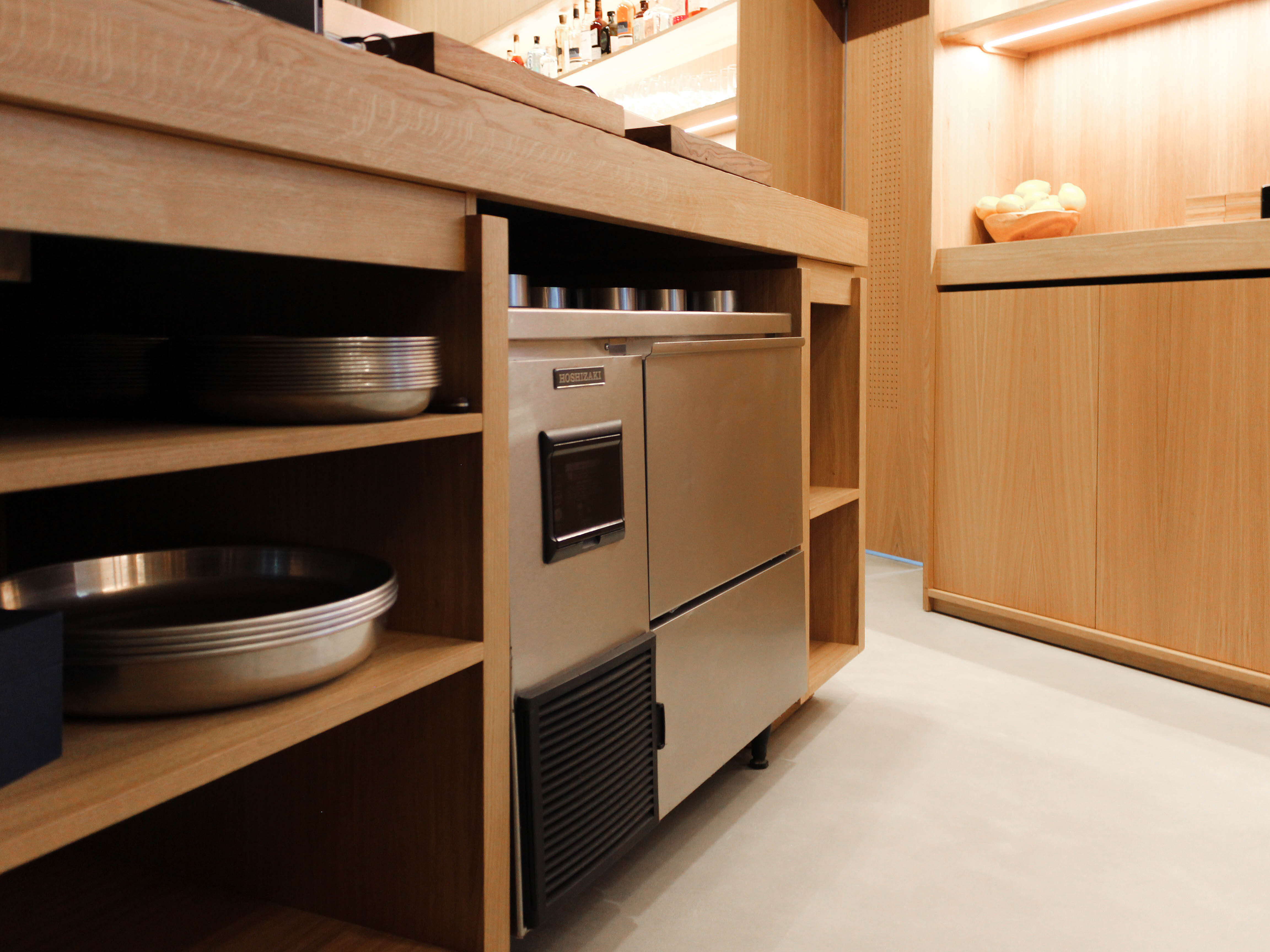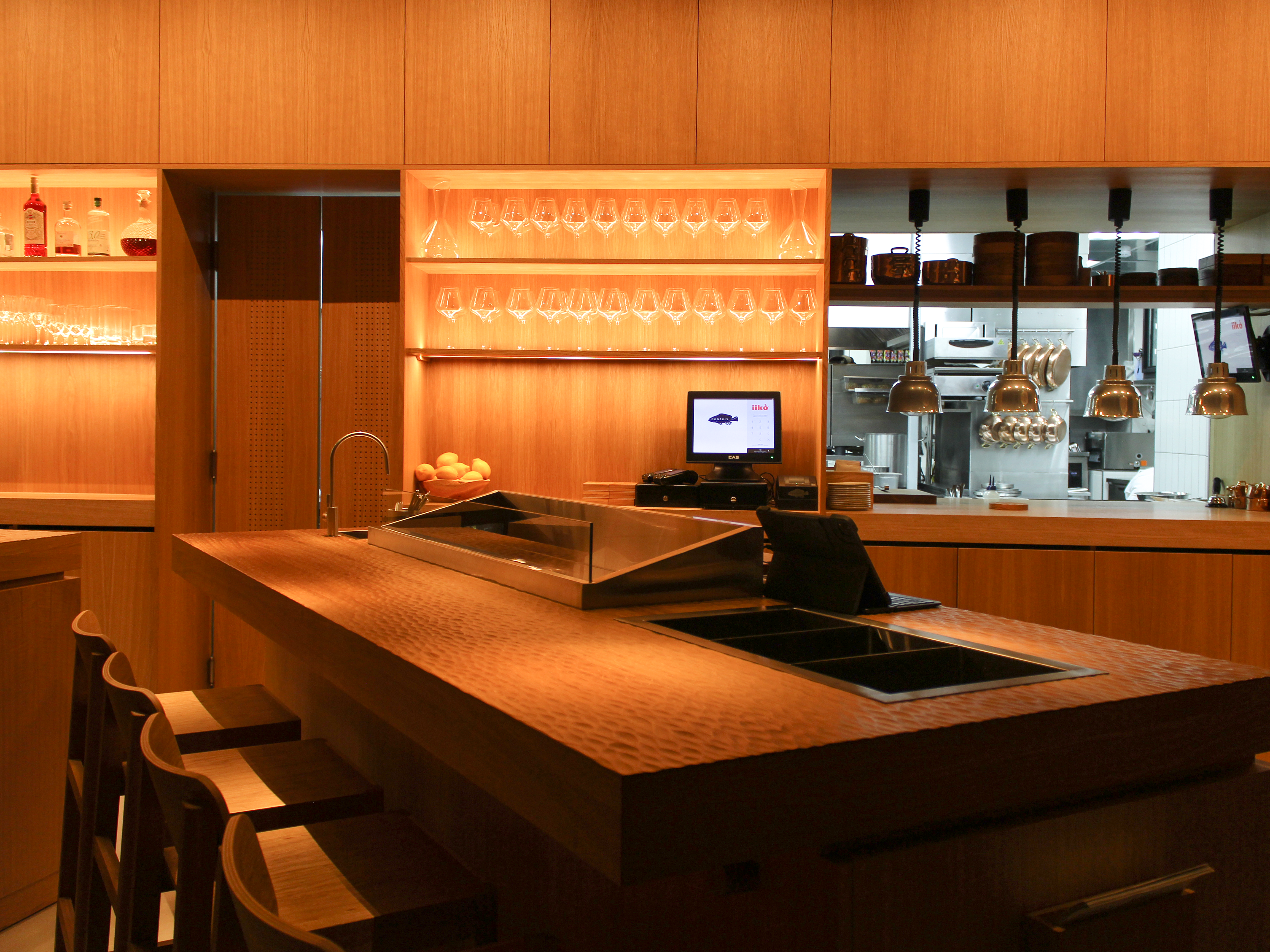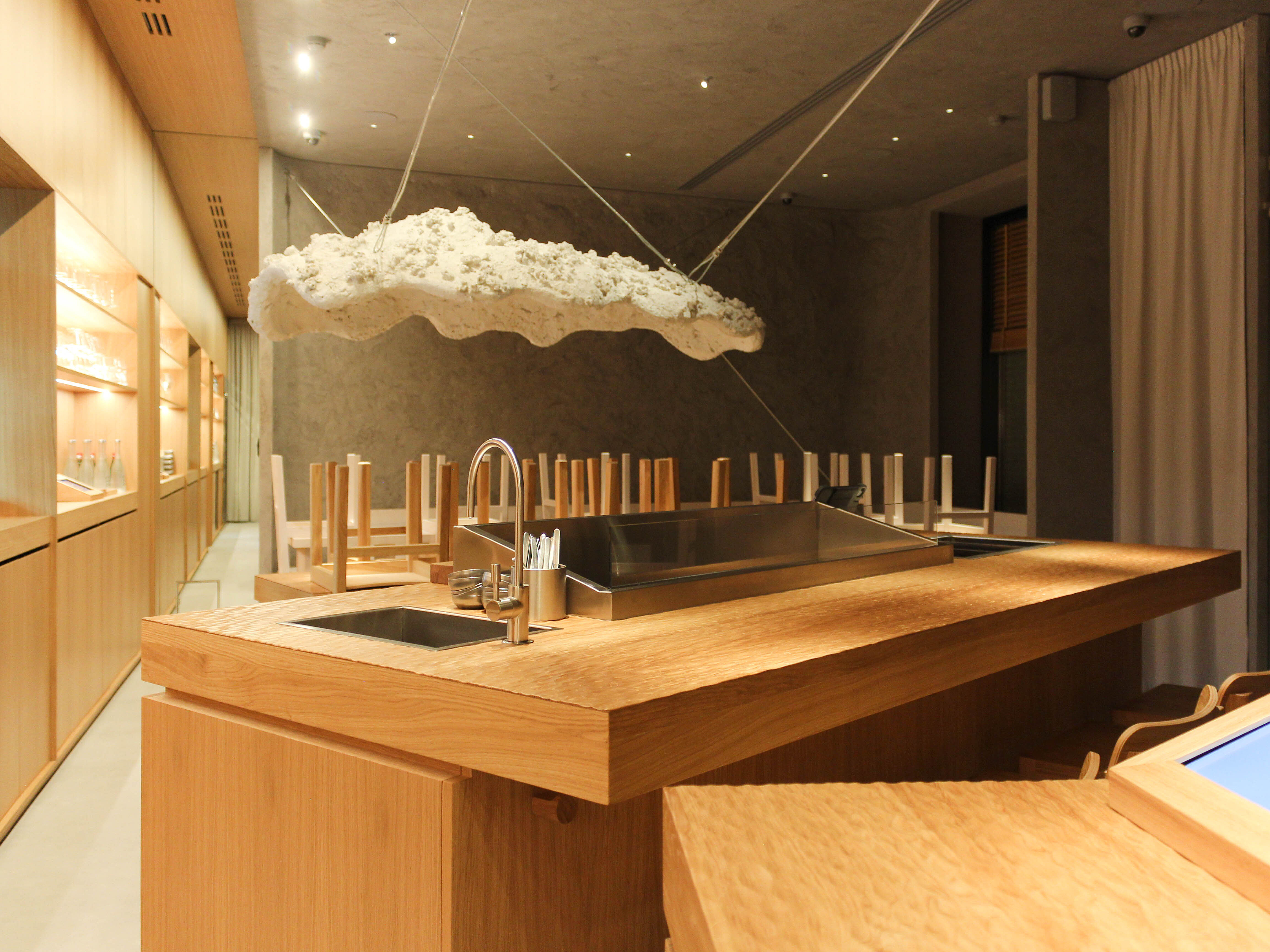 В центре зала поставили контактный устричный бар с ледником, за которым на высоких стульях могут сидеть гости. По эскизу завод BSV-INOX произвел для бара специальные ванны — для льда с устрицами, для вина и моечную со смесителем. Сервисные специалисты «Алтэк» смонтировали изделия в столешницу из дуба.