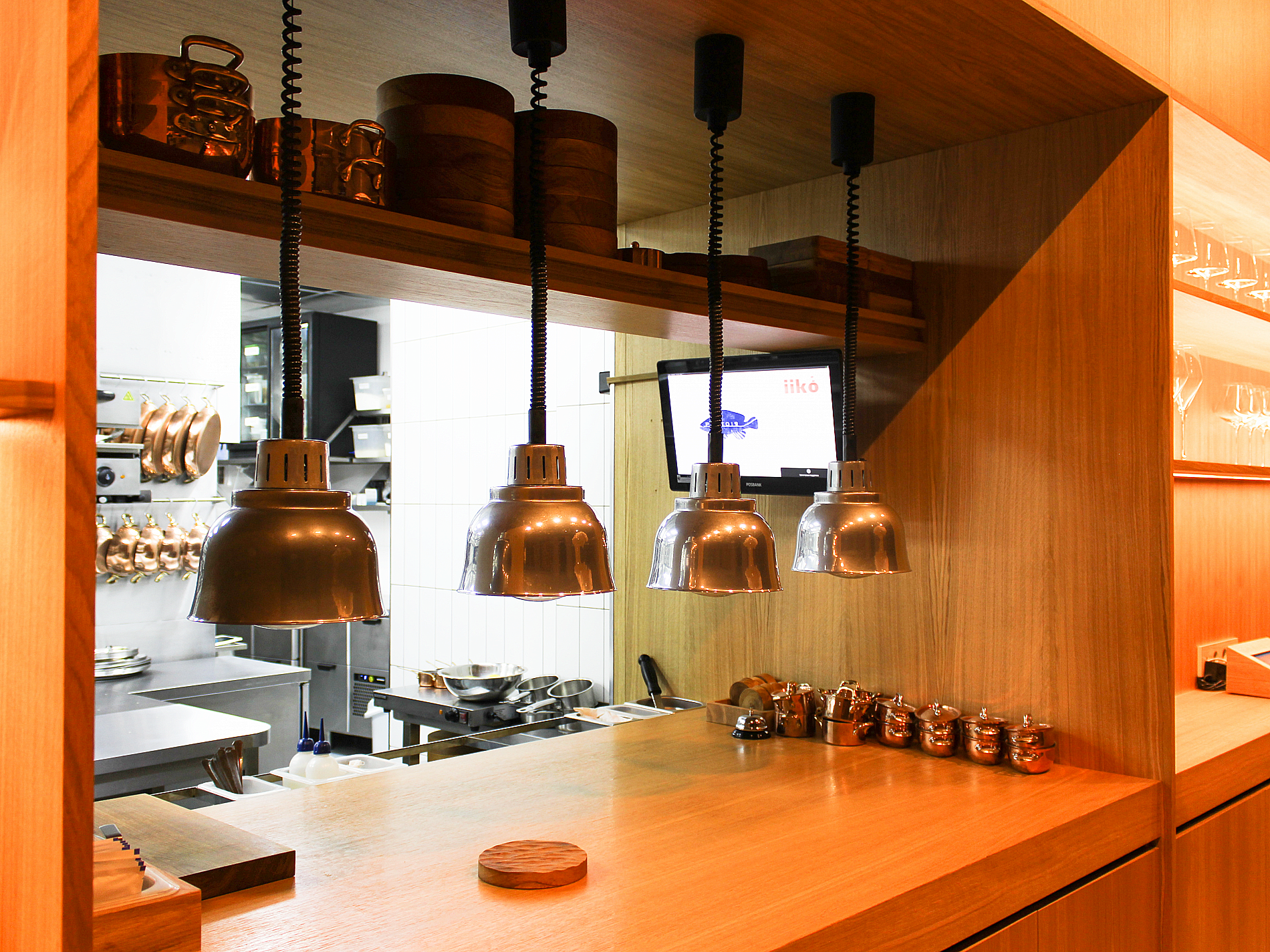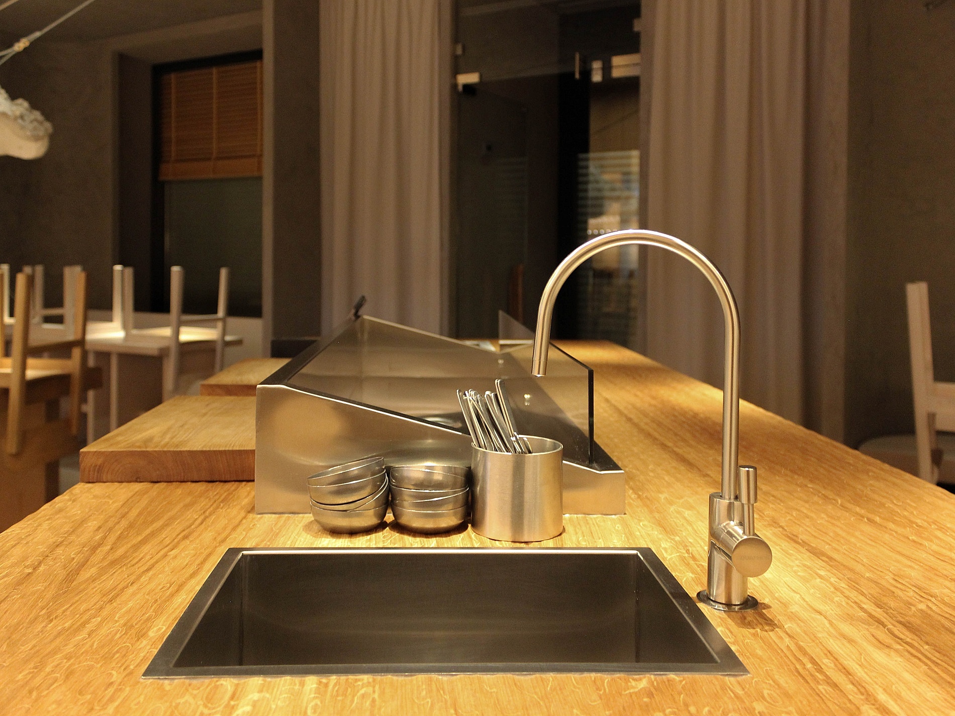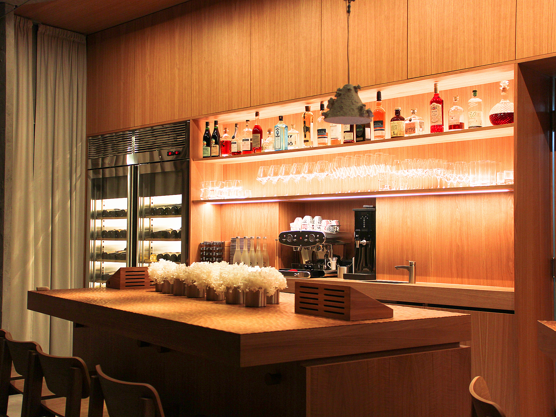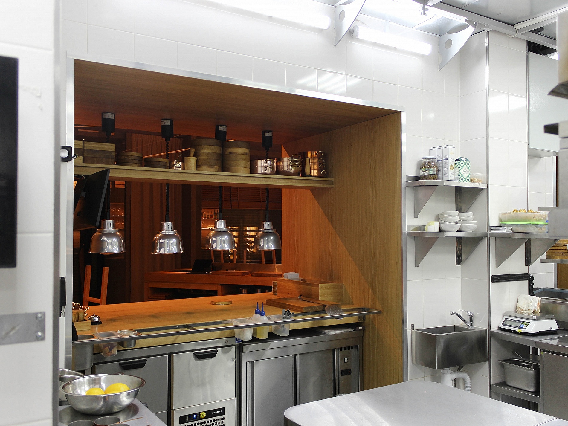 В центре зала поставили контактный устричный бар с ледником, за которым на высоких стульях могут сидеть гости. По эскизу завод BSV-INOX произвел для бара специальные ванны — для льда с устрицами, для вина и моечную со смесителем. Сервисные специалисты «Алтэк» смонтировали изделия в столешницу из дуба.