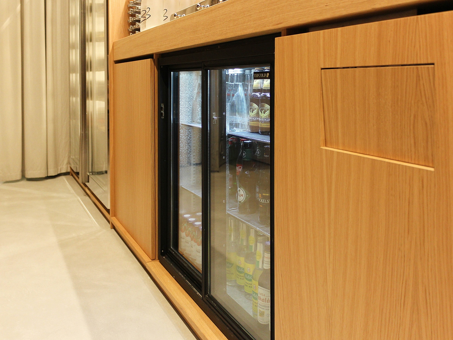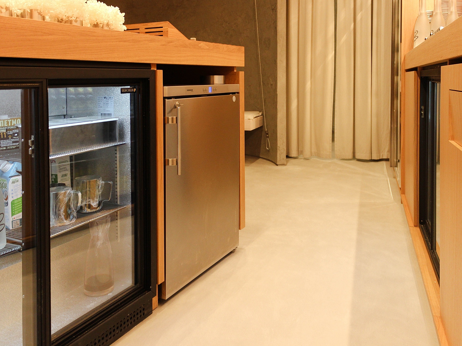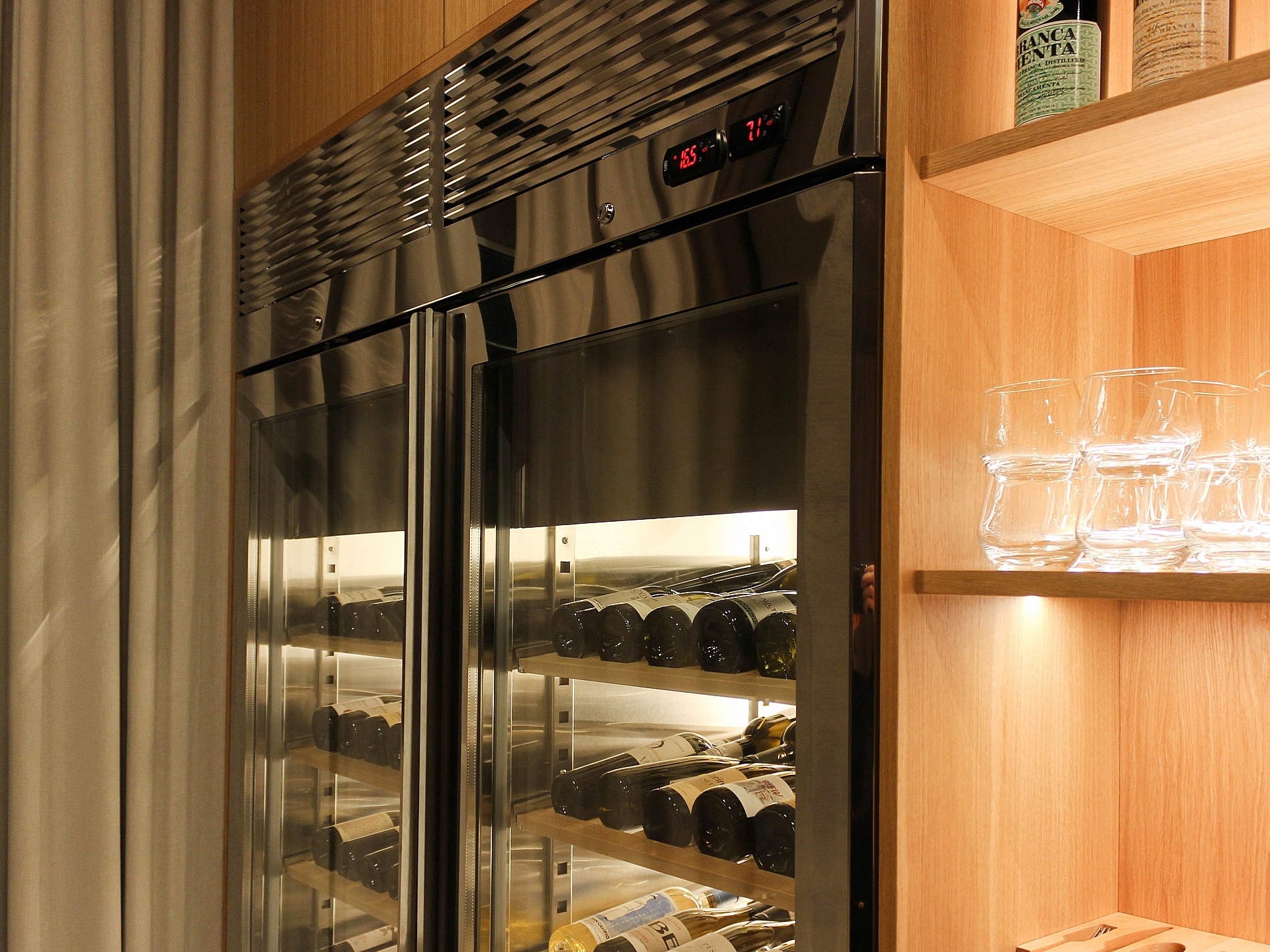 Коллекция разместилась в винных шкафах BSV-INOX из нержавеющей стали. Дизайн шкафов отлично вписался в брутальный интерьер зала.