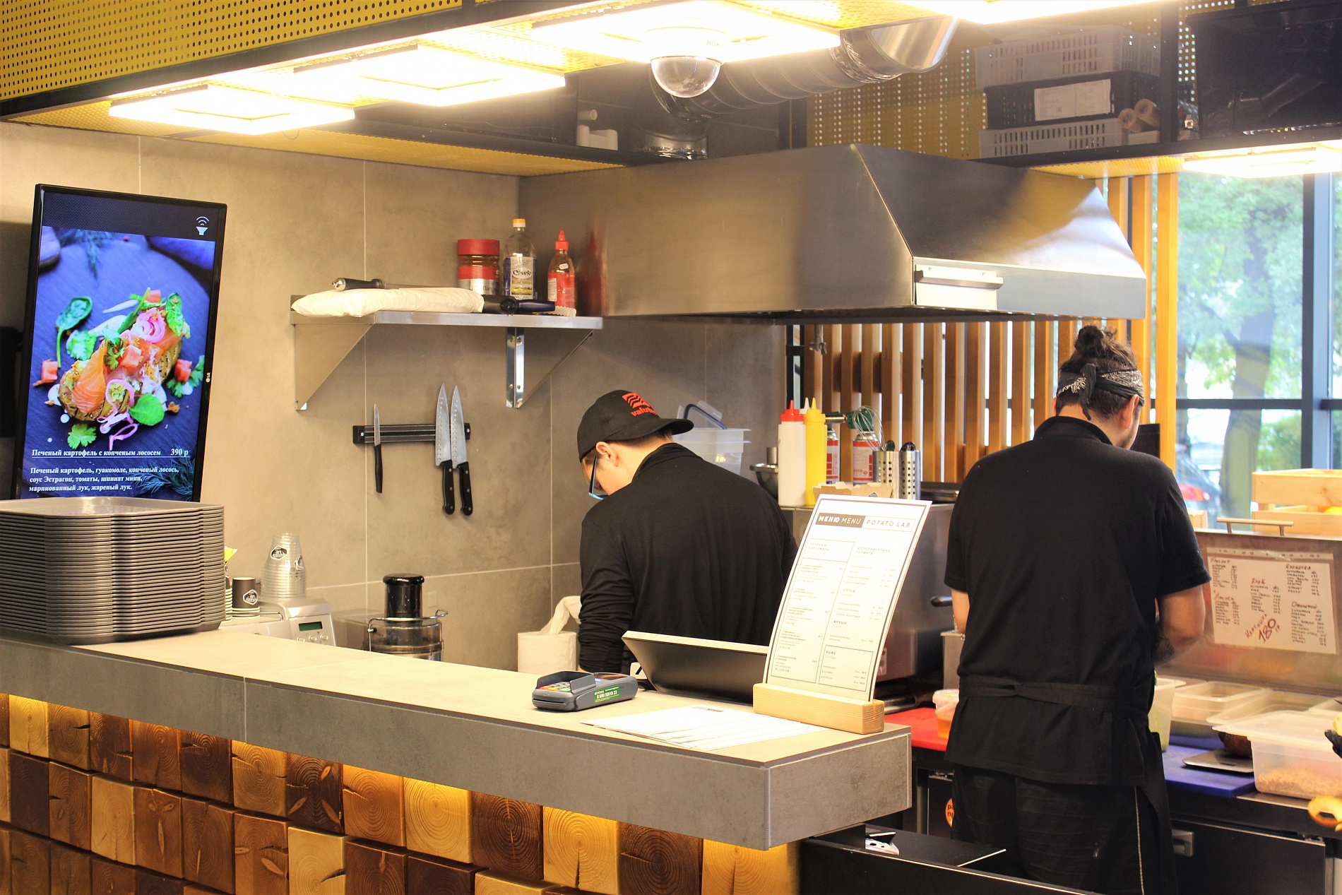 Получилось очень небольшое, но функциональное пространство за стойкой в стильном деревянном киоске. Мы благодарим команду Potato Lab за доверие и желаем успешного развития проекта.