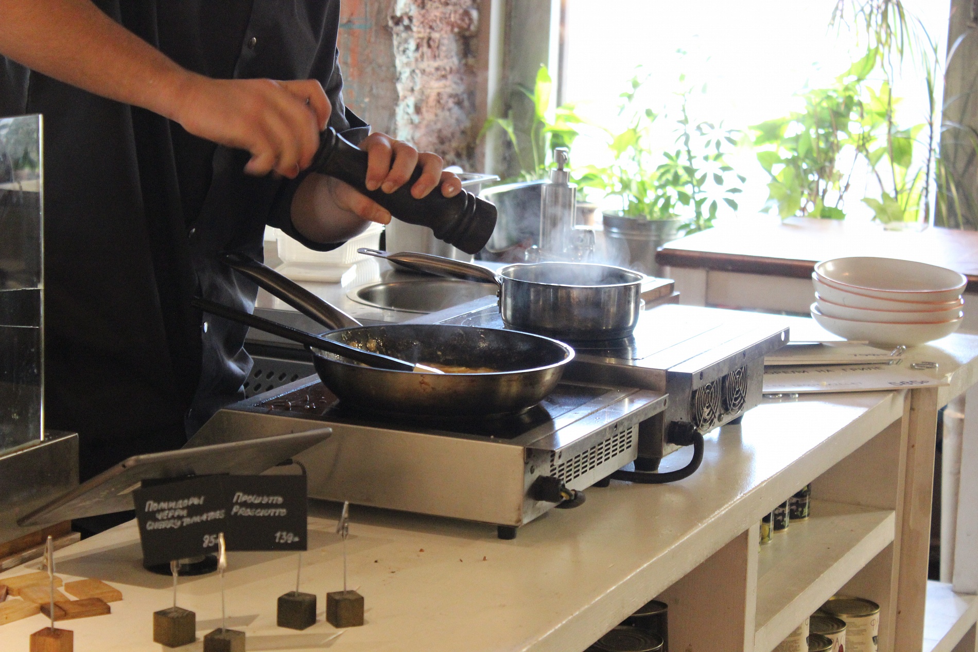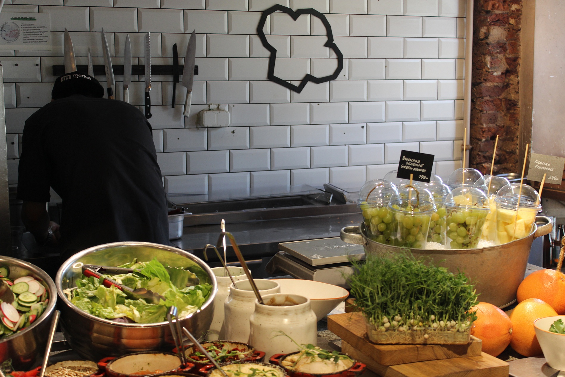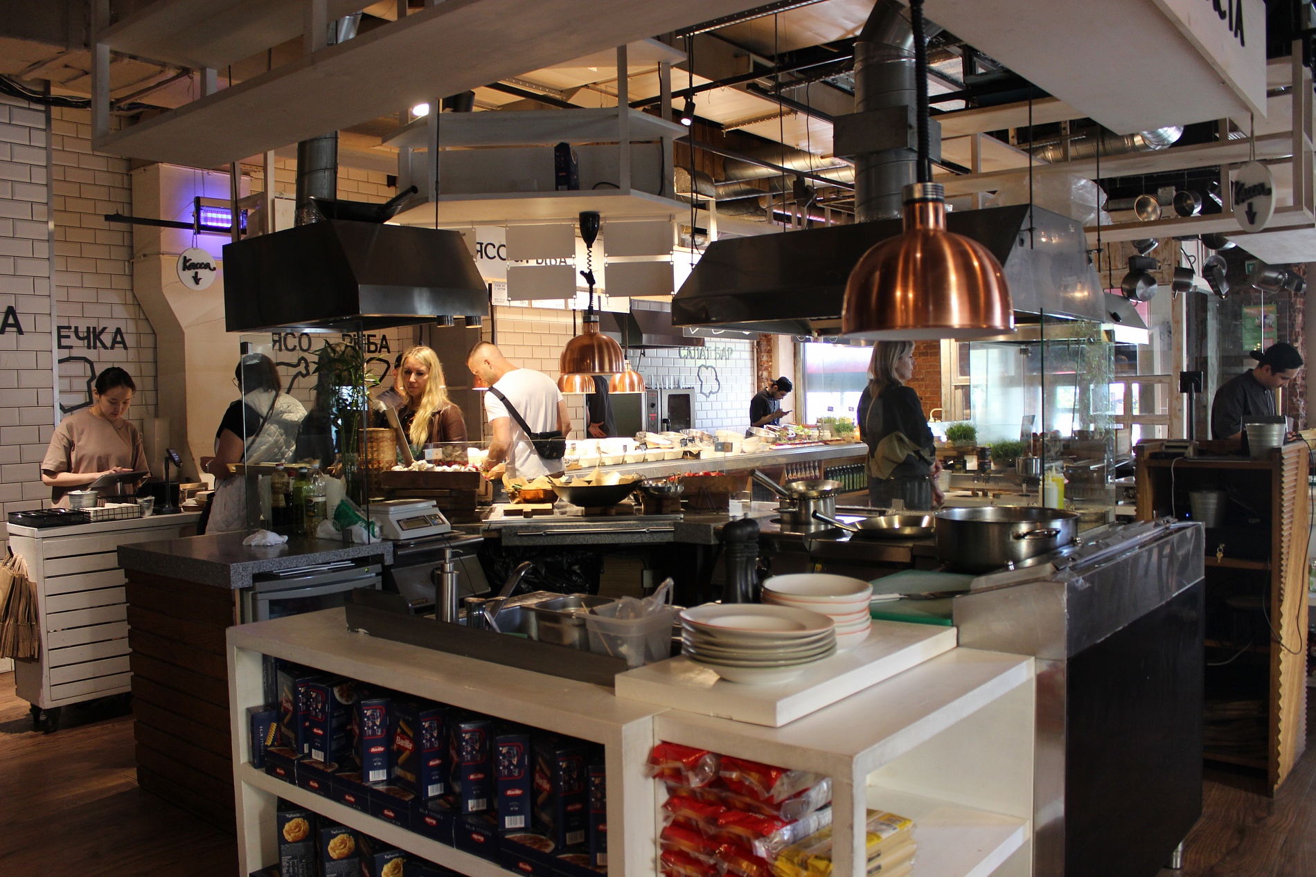 Гости могут собрать свой салат или завтрак, заказать свежую пасту, wok или блюда гриль, которые повара готовят прямо при них. Акцент сделан на разнообразие, свежесть, демократичность и свободу выбора.