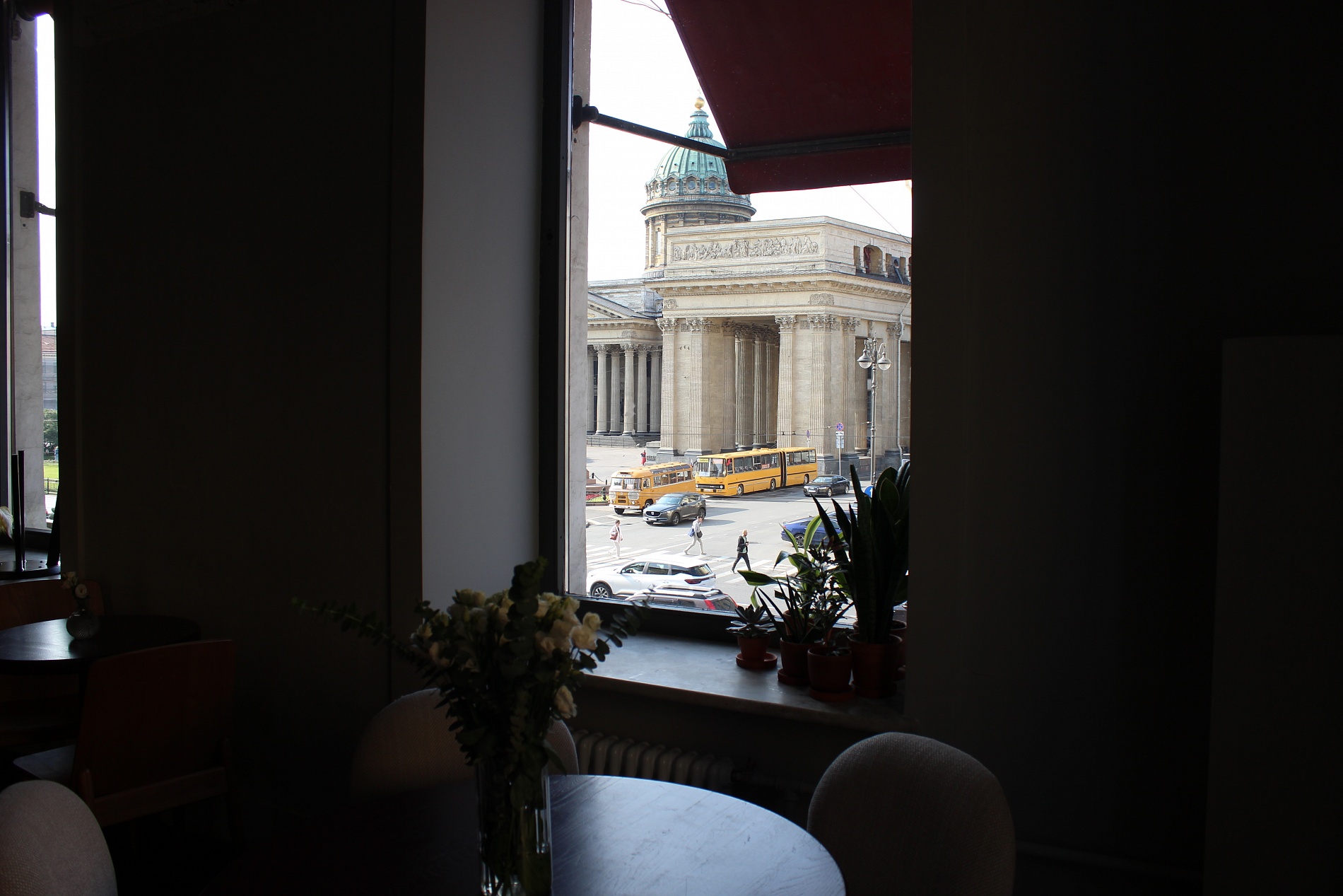 Просторное светлое пространство сочетает в себе уют и функциональность: открытая кирпичная кладка, натуральное дерево, обилие зелени, живые станции приготовления блюд и обновленный бар с видом на Казанский собор.