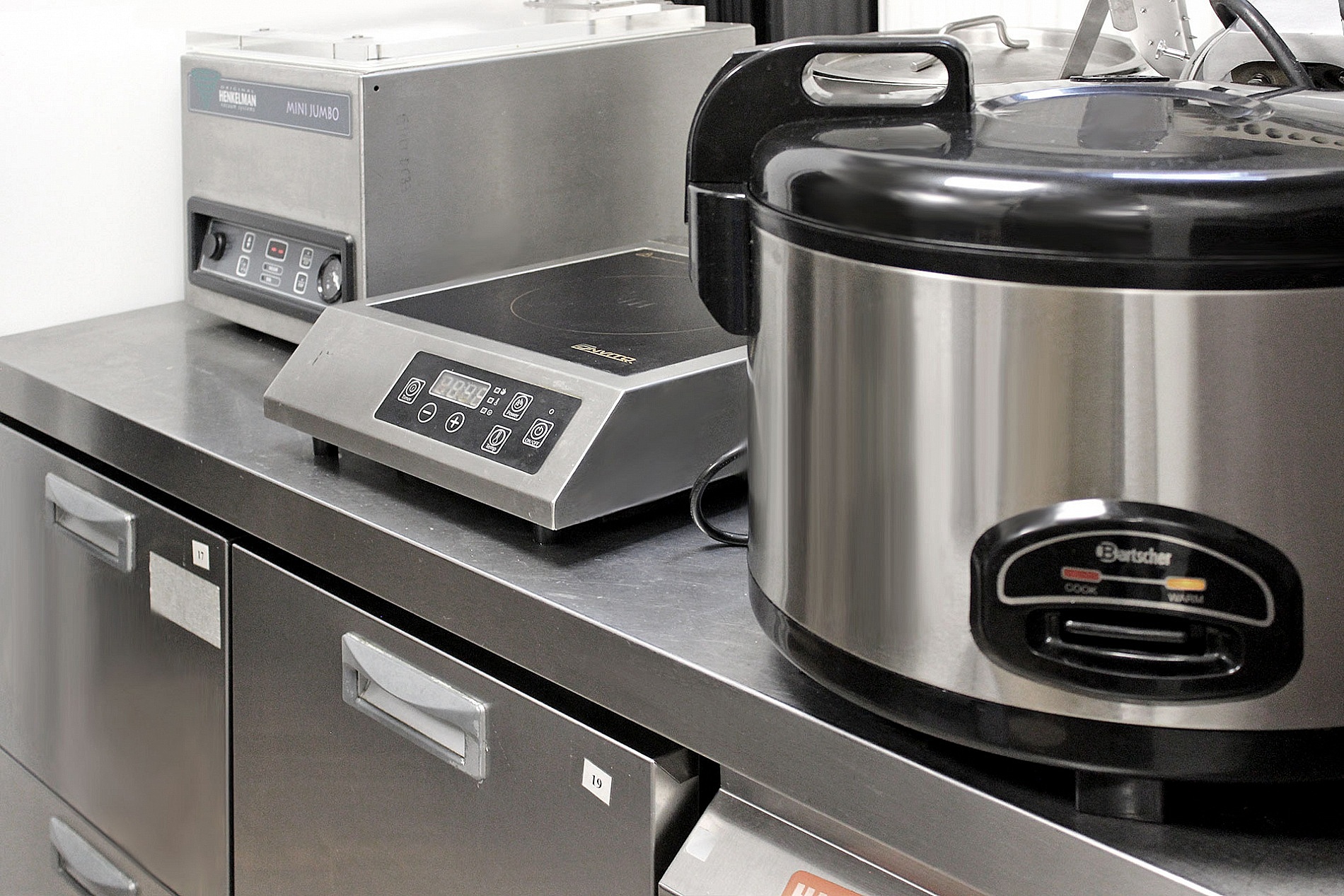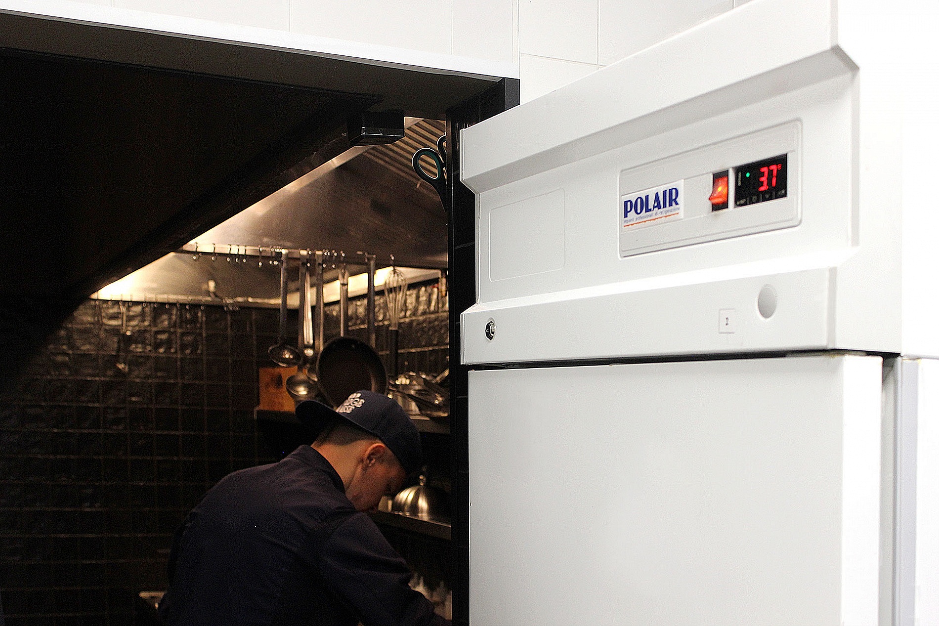 Свежая рыба и морепродукты в меню потребовали установки надежного холодильного оборудования для хранения заготовок. Кроме привычных холодильных и морозильных столов, шкафов, на кухне смонтирован аппарат шоковой заморозки COLDLINE. Из-за ограниченной площади пришлось остановиться на самой маленькой версии шокера Modi W5U на 5 уровней. До -18 °C он способен охладить и заморозить около 17 кг продуктов. Кроме глубокой заморозки, устройство выполняет такие функции, как: размораживание, поддержание температуры, дегидрация, расстойка теста для хлеба, работа с шоколадом (пралине, конфеты, плитки).