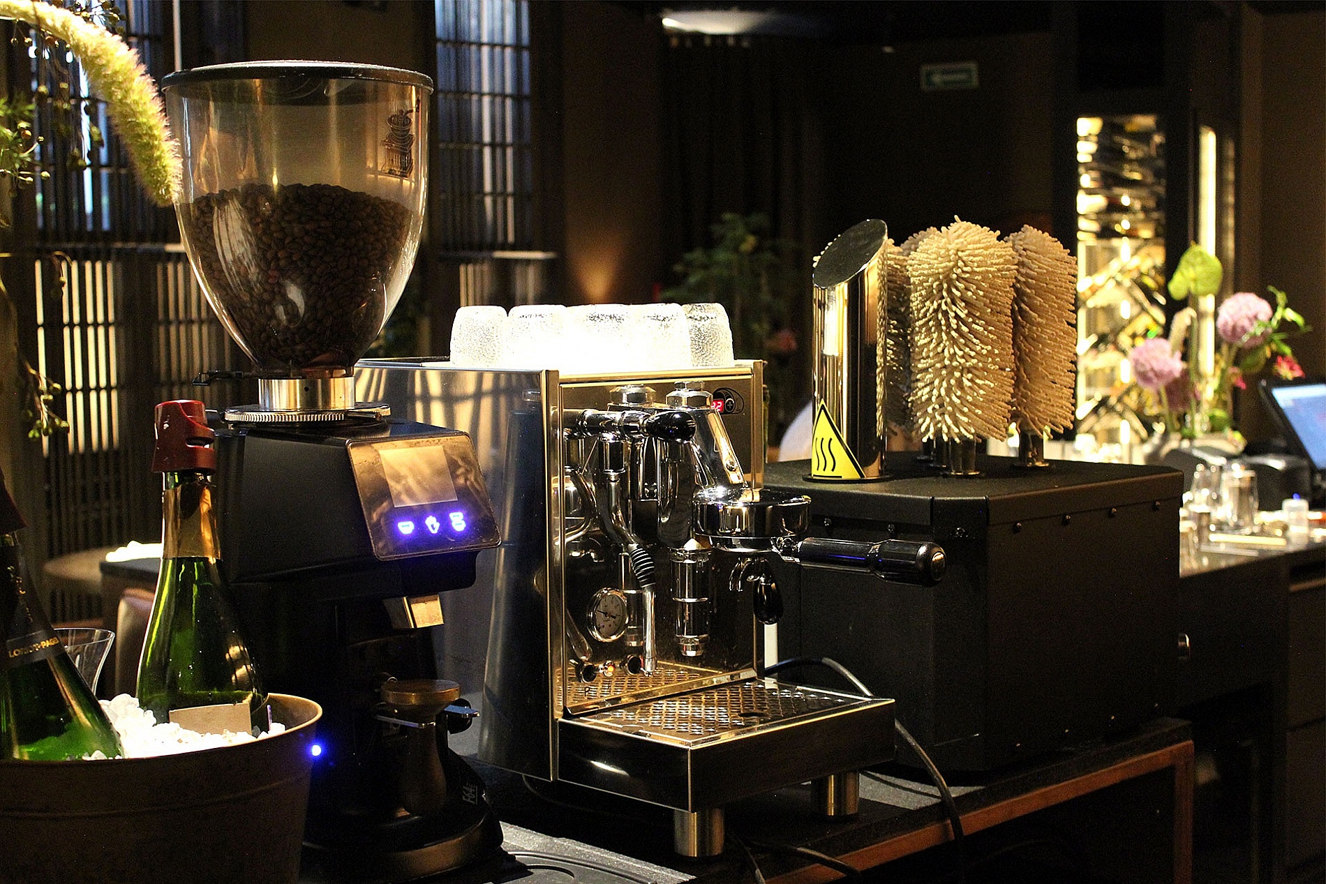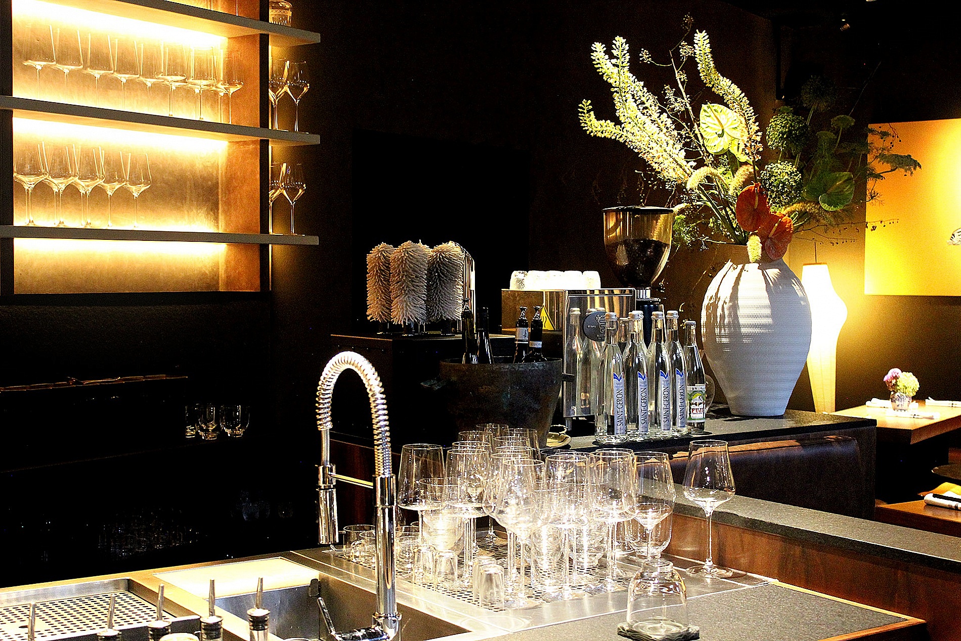 Для большей чистоты бокалов на баре ресторана установлен полировщик BARTSCHER. Съемные щетки из микрофибры в сочетании с горячим воздухом из вентилятора автоматически натирают винные и пивные бокалы за секунды.