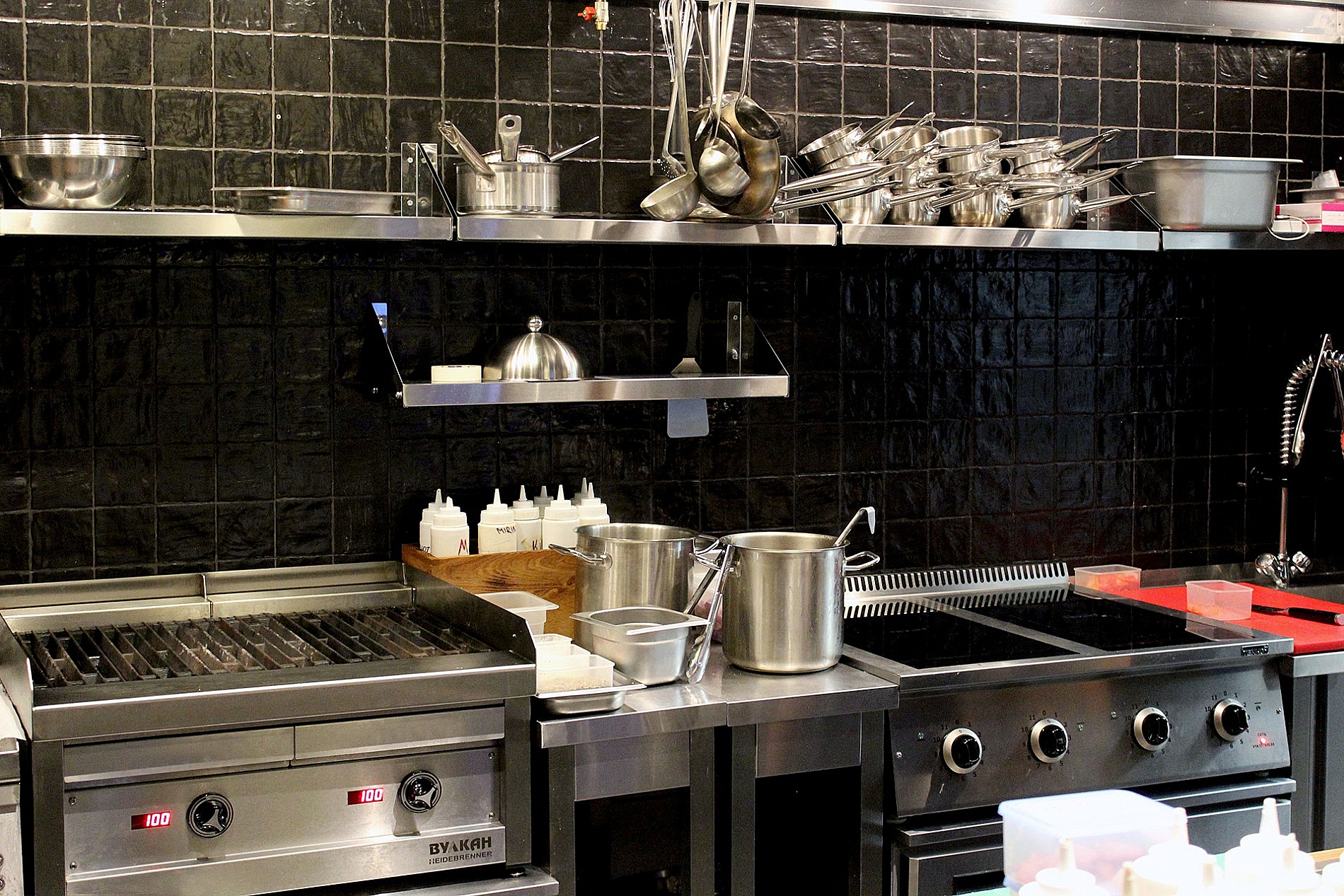 Тепловая линия собрана из гриля Вулкан от HEIDEBRENNER, индукционных плит ТЕХНО-ТТ и двойной фритюрницы TECNOINOX. Мощная вытяжная система защищает пространство ресторана от распространения неприятных запахов еды.