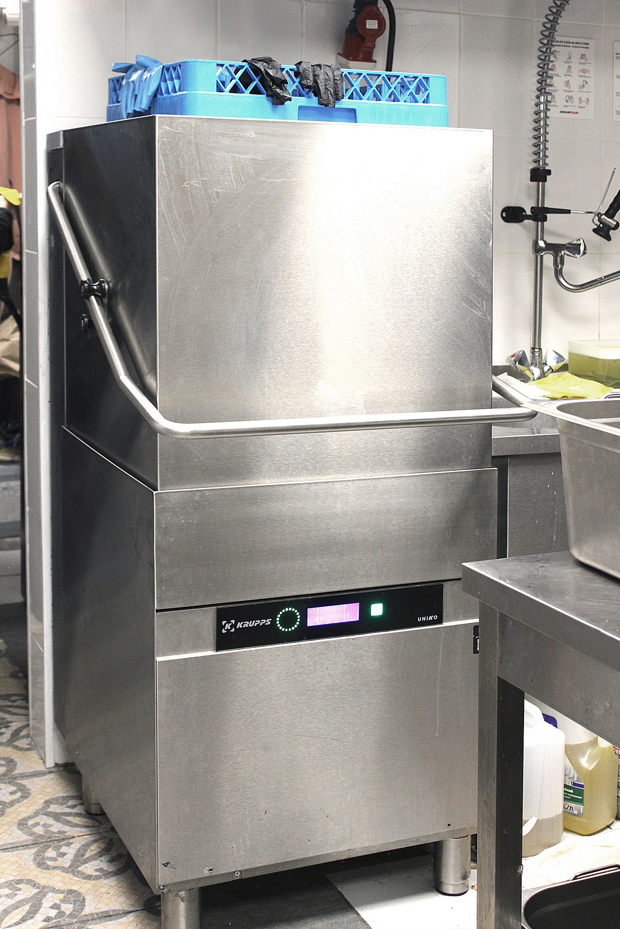 За чистоту посуды отвечает купольная посудомоечная машина KRUPPS. Ее производительность – 60 кассет в час. Есть разные циклы мойки — от супер быстрой на 60 секунд до более основательной на 300 секунд. Машина оснащена функцией самоочистки, удаляет остатки пены и мусора со дна. Это настоящая «рабочая лошадка», которая безупречно моет посуду, гарантирует максимальный уровень гигиены и безопасности, минимизирует расход воды, электричества и моющих средств, бесперебойно служит годами.