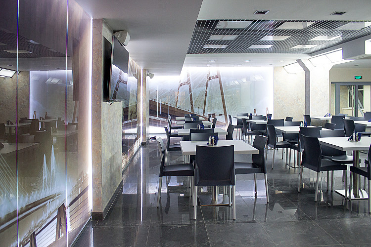 Одной из важнейших задач проекта стояло организовать столовую для руководства предприятия и приема важных гостей, где было бы удобно проводить бизнес-встречи с партнерами и просто приятно отдыхать в течение рабочего дня. Был разработан дизайн-проект помещения, выбраны соответствующие материалы: напольное покрытие из ламината, облицовка стен панелями из шпона, которые имитирую ценные породы дерева. С учетом индивидуальных пожеланий заказчика была сконструирована барная стойка, она декорирована настоящими вантами, которые напоминают о специфике предприятие – изготовление металлических конструкций для мостов.