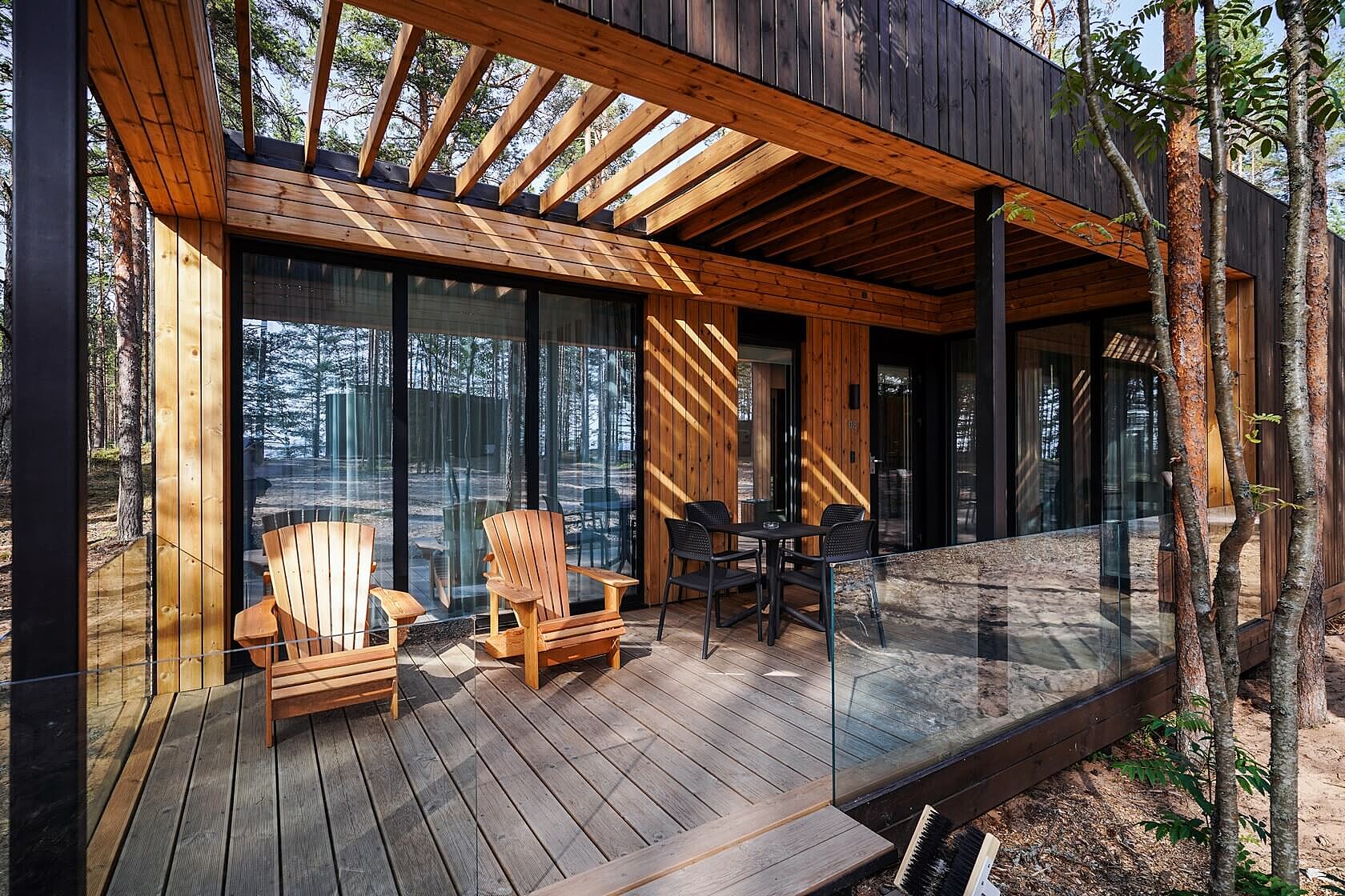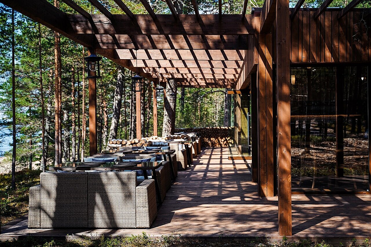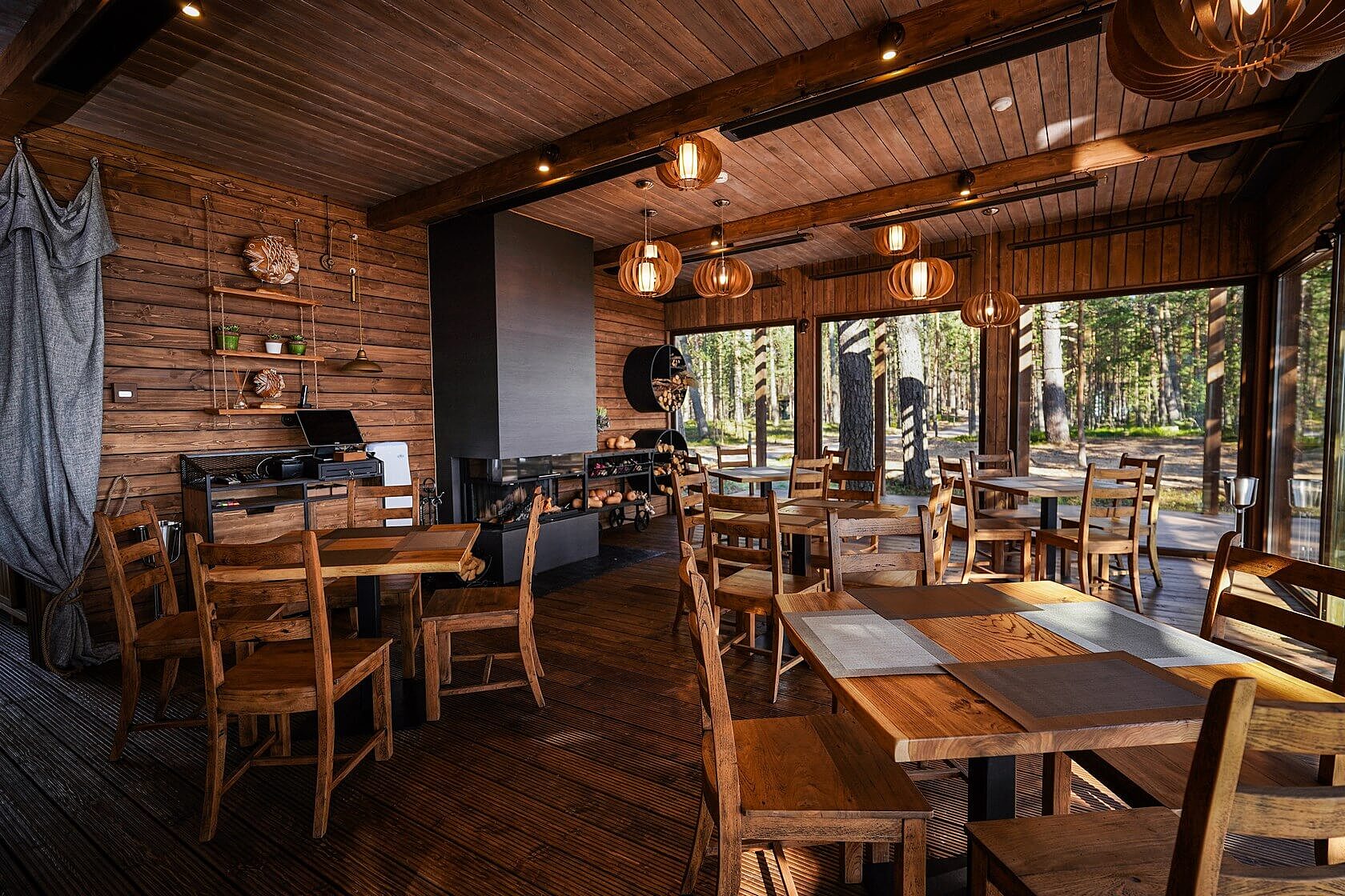 В каждом домике — панорамные окна, отдельный вход, сауна и кухня. На территории есть спортивные площадки и кафе с открытой барбекю-террасой. Заведение может разместить 24 гостя внутри и 20 на террасе. К услугам постояльцев — прачечная.