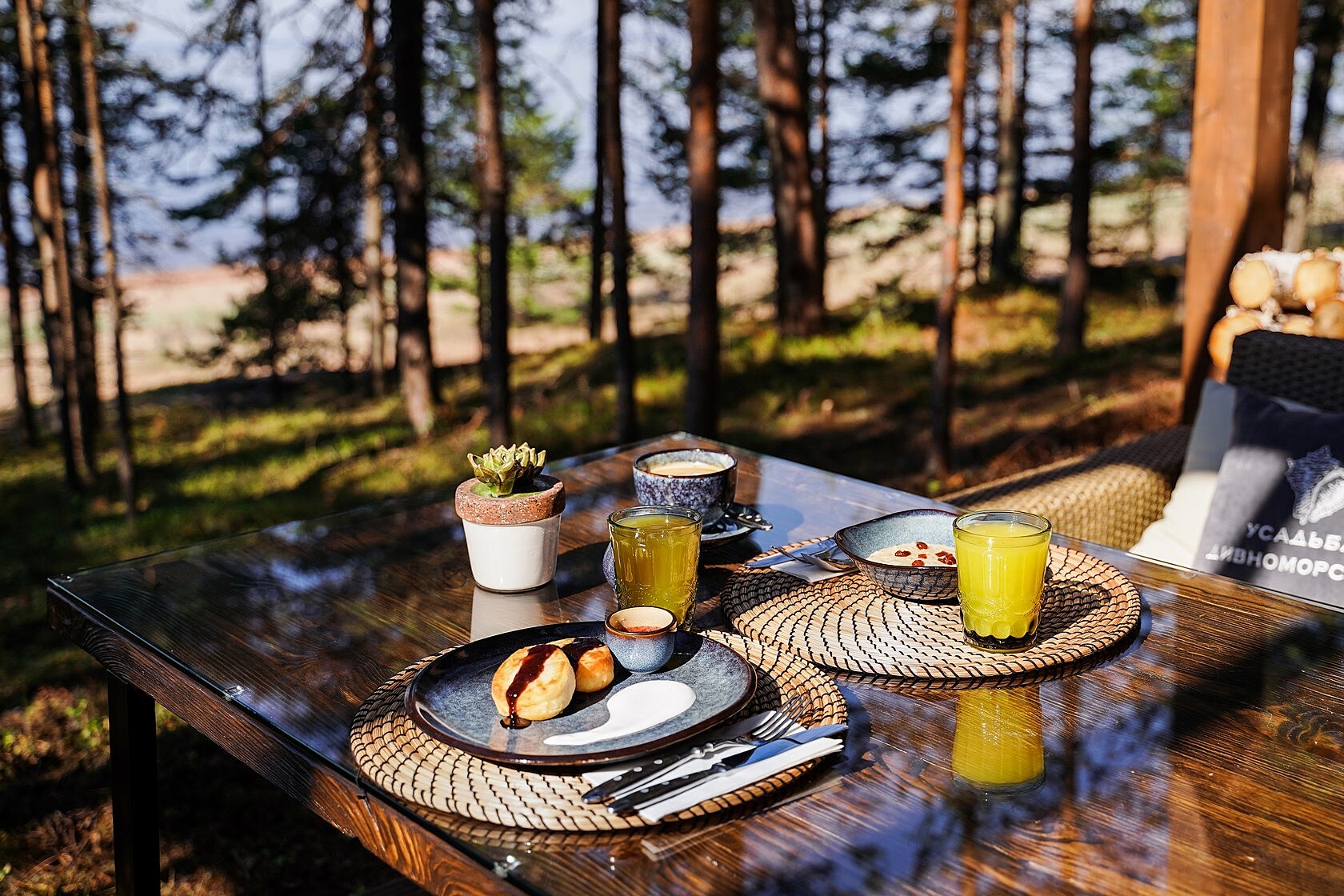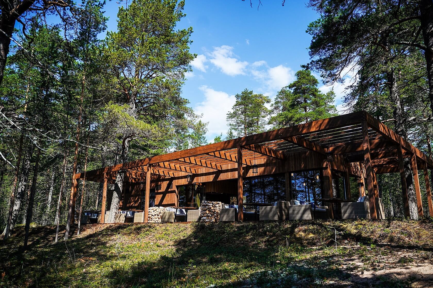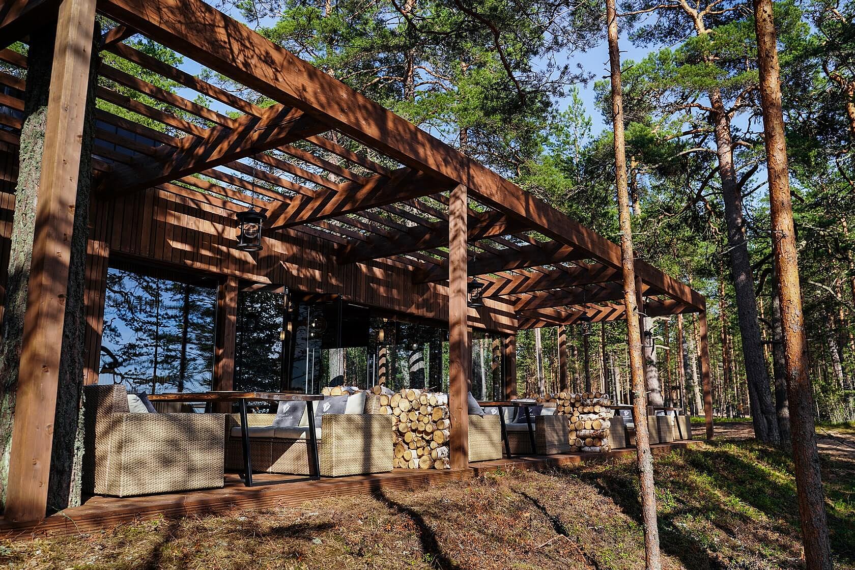 В каждом домике — панорамные окна, отдельный вход, сауна и кухня. На территории есть спортивные площадки и кафе с открытой барбекю-террасой. Заведение может разместить 24 гостя внутри и 20 на террасе. К услугам постояльцев — прачечная.
