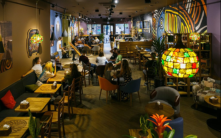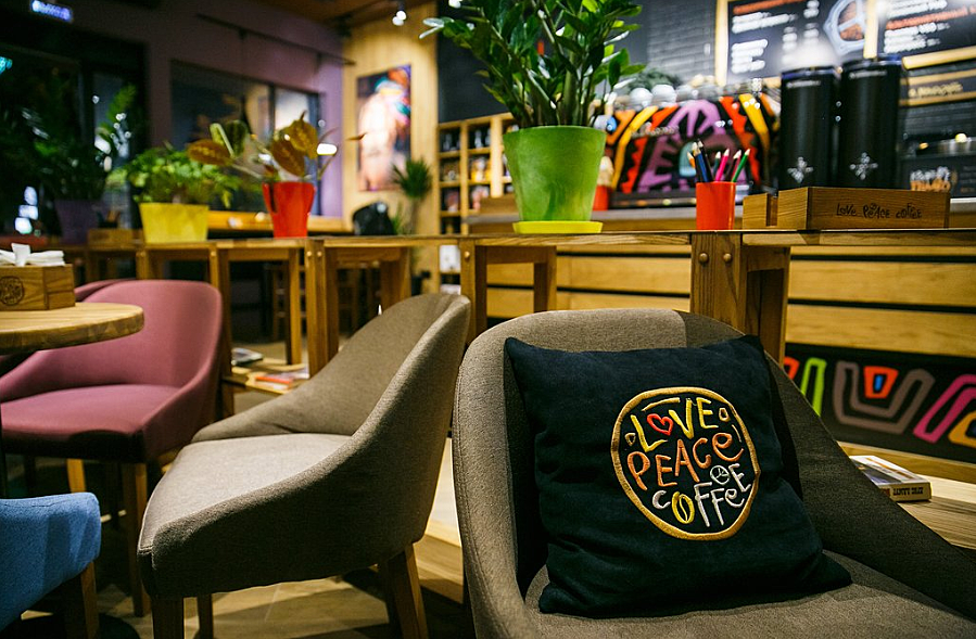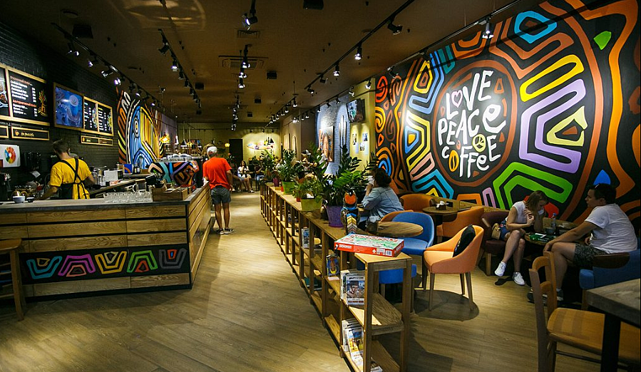 Концепция: международная сеть кофеен, которая продвигает философию Love.Peace.Coffee