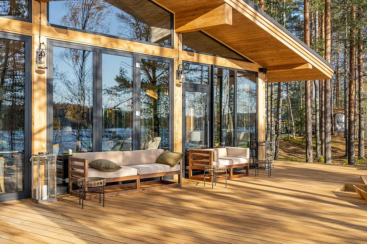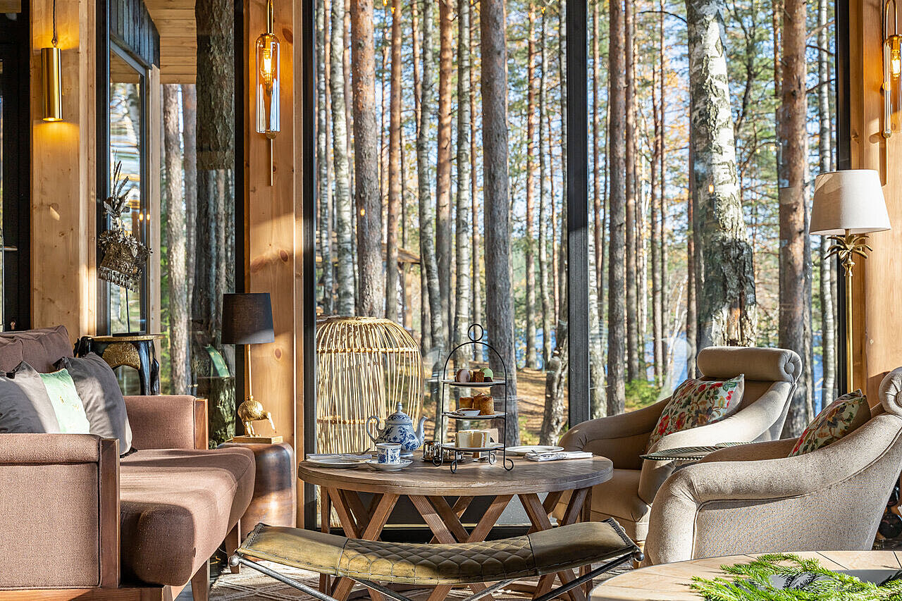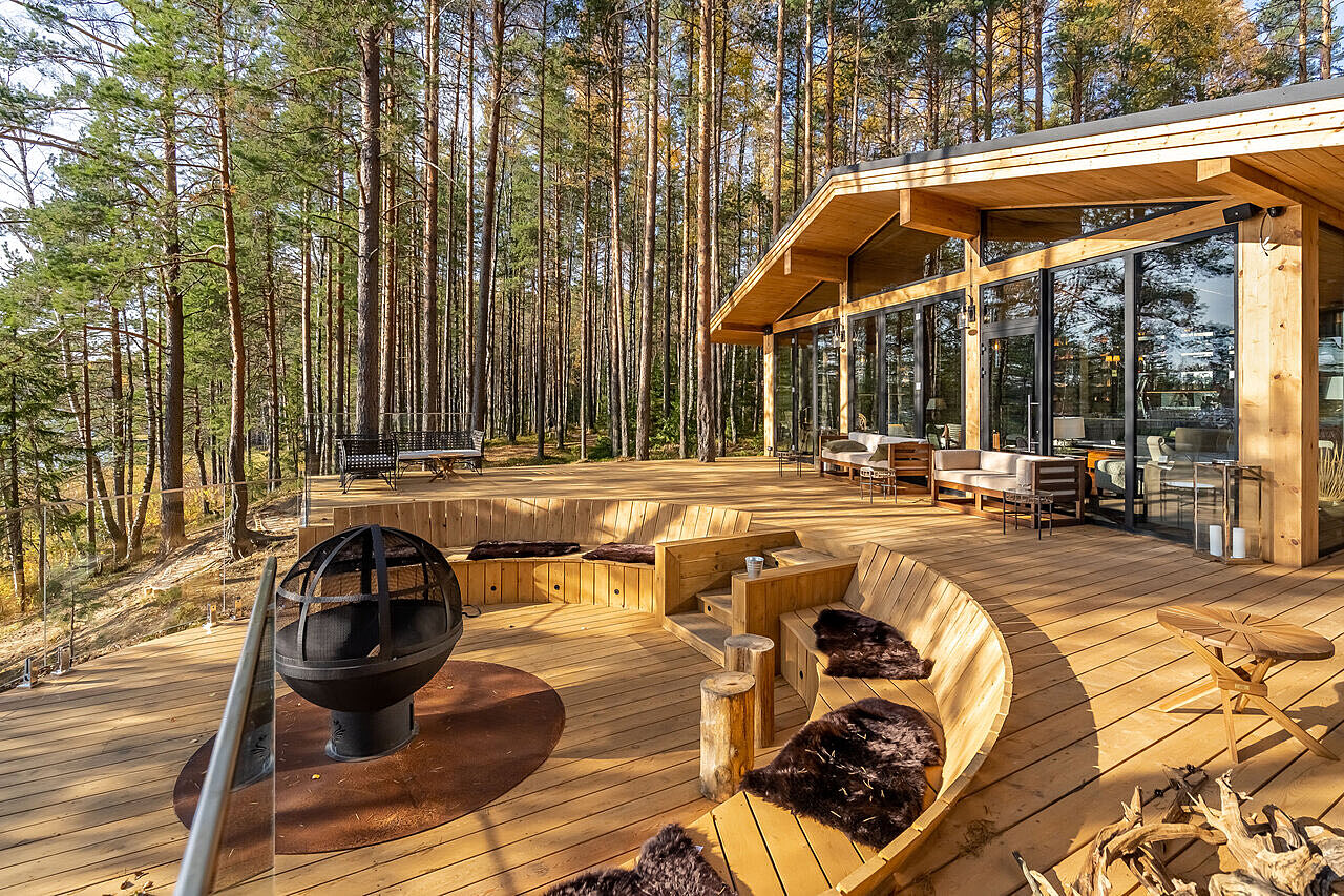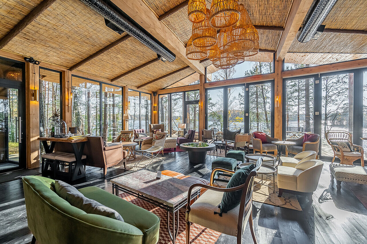 На территории расположено 16 номеров в стиле сафари. Есть варианты с увеличенной террасой и уличным грилем, а остальные домики оснащены собственной костровой зоной BBQ и террасой поменьше. Кроме живописных пейзажей и озера, можно посетить банный комплекс с травяной парной и горячей купелью, арт-объект «Улей», лесные кинопоказы, а также насладиться авторской кухней и напитками.
